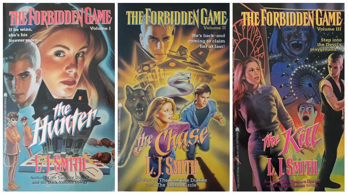 L.J. Smith’s The Forbidden Game trilogy (1994) features an actual board game, albeit one in a plain white box bought from a hot dude with white hair named Julian. The directions tell the players to draw their nightmares on cards and place them in a cardboard house they assemble – nothing suspicious about that! Only one friend dies before they can escape the game in The Hunter, so why not come back for round 2?
