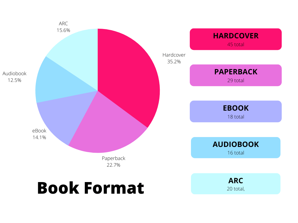 For the first half of the year, I read more hardcovers than any other format. This may not be true if I factored in the various formats of the ARCs I read, as most were paperback or ebook. My ebook stats are probably higher than last year, as I recently downloaded the Netgalley Shelf app and got myself a new ereader.